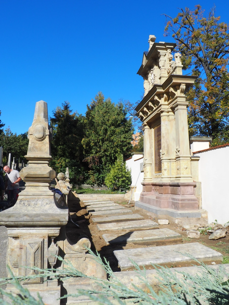 V letech 2017–2018 jsme pro Opatství Staré Brno řádu sv. Augustina provedli kompletní památkovou obnovu náhrobku. Součástí prací bylo statické zajištění objektu, výměna poškozených kamenných prvků, doplnění chybějících modelací, konzervace pískovce a obnova zlacených nápisů a reliéfů. Součástí obnovy byla také instalace nových soch sv. Augustina a sv. Rity a osazení informačních desek se jmény pohřbených osobností.