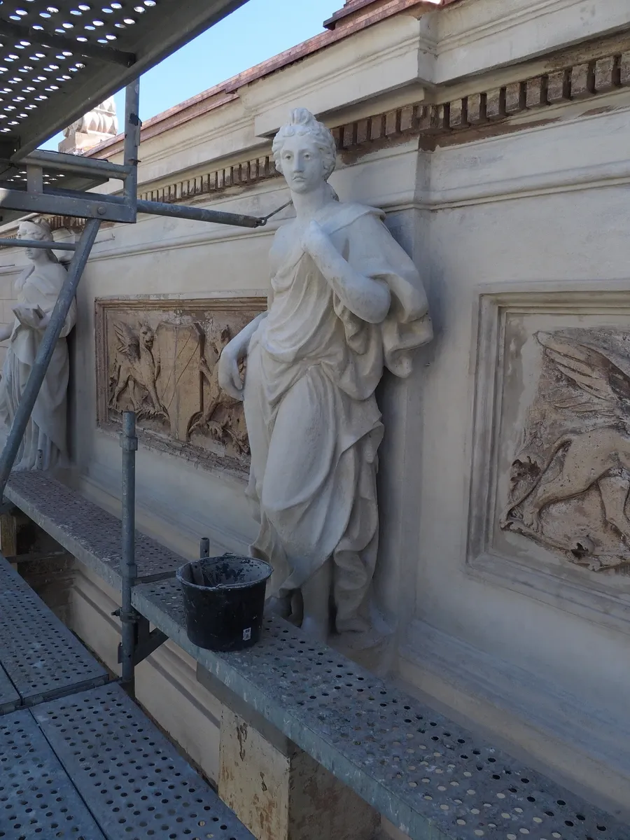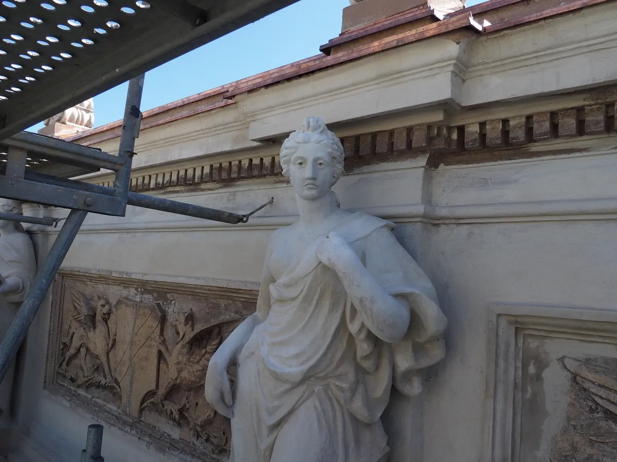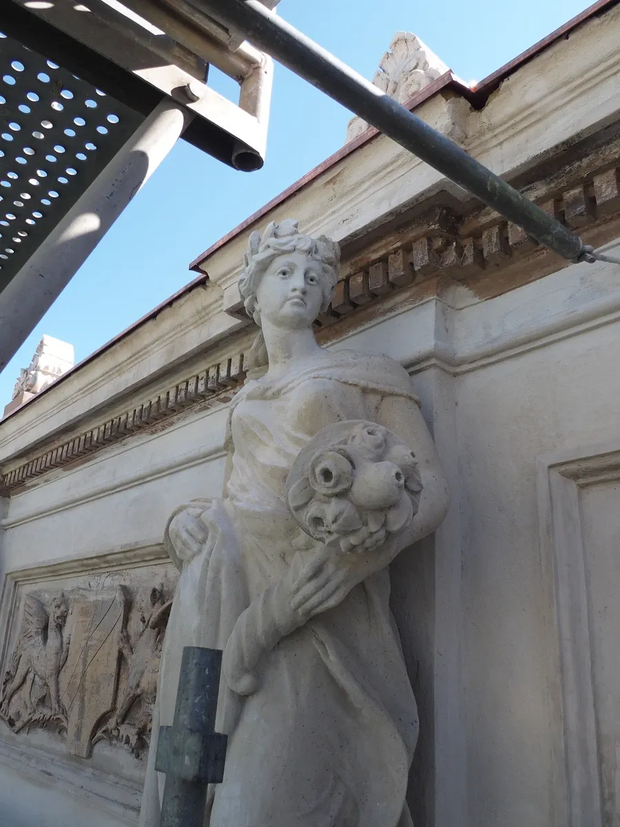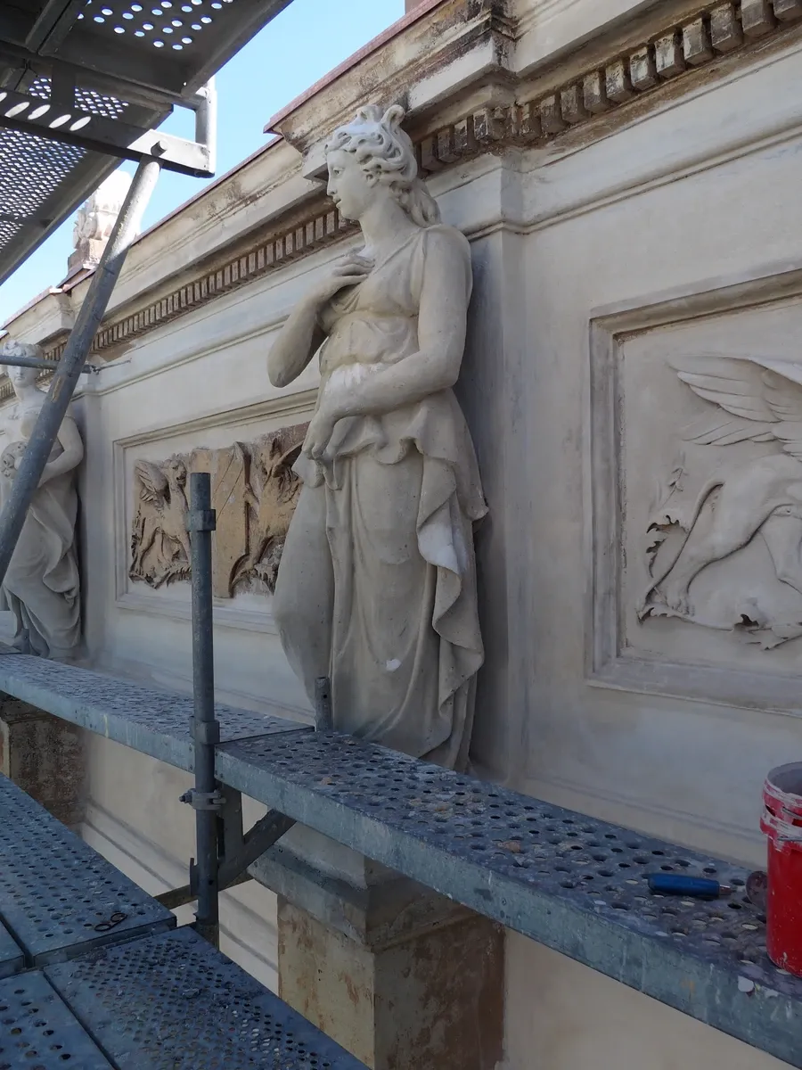 V roce 2017 jsme provedli památkovou obnovu souboru soch umístěných na atice budovy. Sochy byly demontovány a nahrazeny kopiemi – výdusky z umělého kamene. Originály byly zrekonstruovány a uloženy v interiéru budovy.