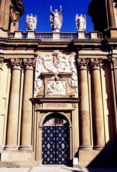 Bohatě profilovaná a bosovaná fasáda nádvoří pochází z opravy v letech 1845-1852 a při rekonstrukci byla nahrazena novými omítkami, přesně kopírujícími původní provedení. Současně byly restaurovány všechny kamenné prvky fasády, obnoven zničený kříž a zlacený nápis na štítu kaple. Do středu nádvoří byla umístěna socha Františka z Dietrichsteinu od pražského sochaře Emanuela Maxe z roku 1853, provedená z kararského mramoru.