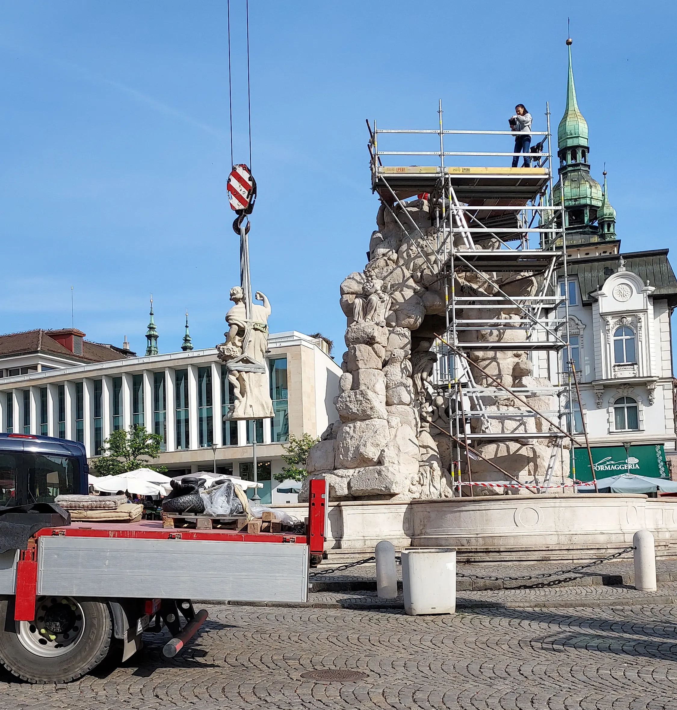 Při poslední restaurátorské obnově v letech 2024–2025 byla vrcholová socha Evropy nahrazena výduskem z umělého kamene. Originál sochy je nyní umístěn v budově Úřadu městské části Brno-střed, Dominikánská 2.
