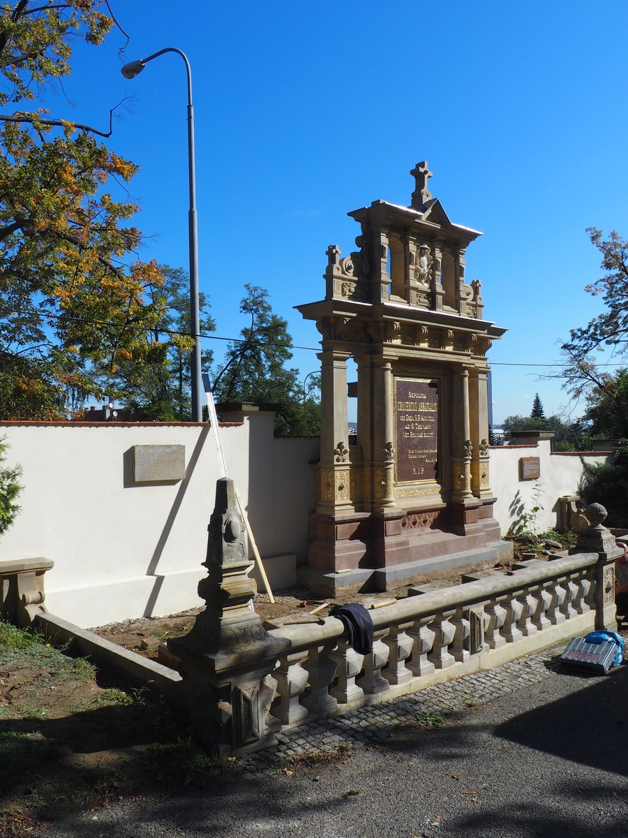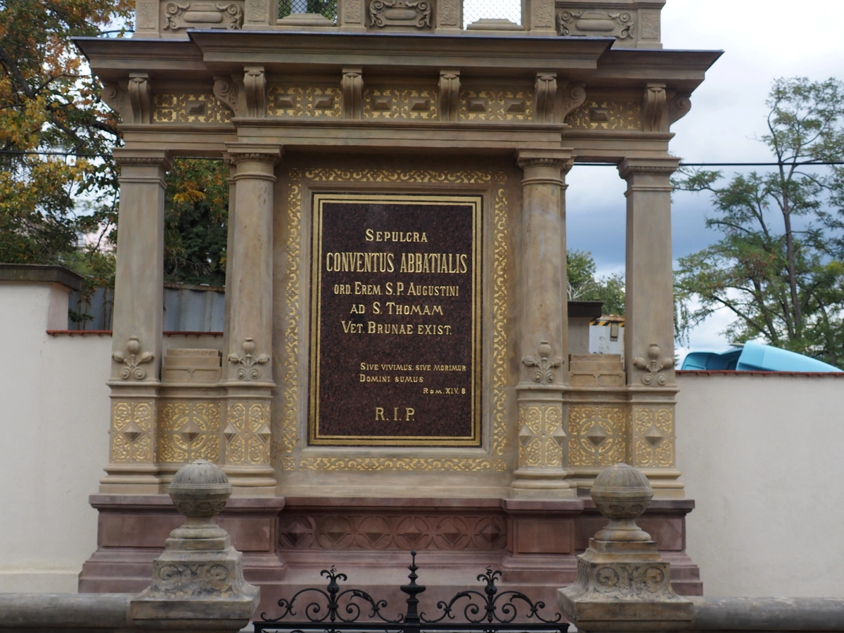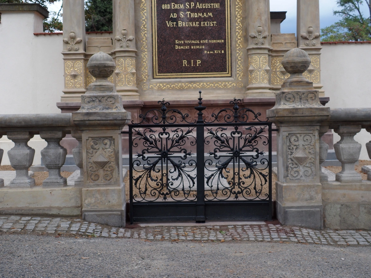 V letech 2017–2018 jsme pro Opatství Staré Brno řádu sv. Augustina provedli kompletní památkovou obnovu náhrobku. Součástí prací bylo statické zajištění objektu, výměna poškozených kamenných prvků, doplnění chybějících modelací, konzervace pískovce a obnova zlacených nápisů a reliéfů. Součástí obnovy byla také instalace nových soch sv. Augustina a sv. Rity a osazení informačních desek se jmény pohřbených osobností.