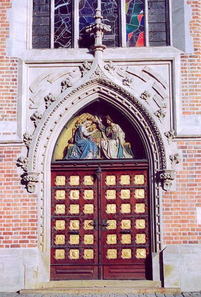 Sousoší Korunování Panny Marie v tympanonu je dílem tyrolského sochaře Aloise Winklera z roku 1889. Kovové reliéfní pozlacené desky z výzdoby vrat vyrobil v roce 1888 jihlavský zámečník Karl Cerl podle návrhu vídeňského architekta Friedricha Schmidta. Novogotický pískovcový portál zhotovil brněnský sochař a kameník Johann Tomola podle návrhu Augusta Prokopa.