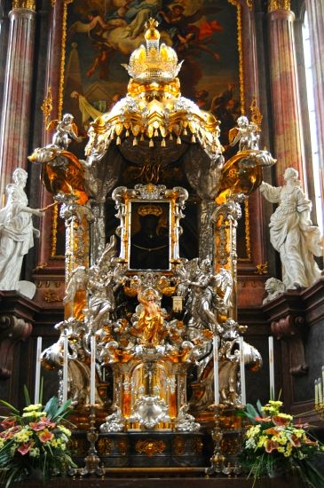 Oltář nechal zhotovit u augspurského zlatníka Johanna Georga Herkommera převor augustiniánského kláštera v Brně Ondřej Zirkl. Stalo se tak při příležitosti korunování palladia "Černé Madony" v roce 1736, oltář byl pořízen pro důstojné umístění tohoto uctívaného obrazu v Mariánské kapli kostela sv. Tomáše. Augustiniáni byli v r. 1783, z kláštera u sv. Tomáše přemístěni do bývalého kláštera cisterciaček na Starém Brně, oltář s obrazem Madony sem přestěhovali a umístili jako hlavní oltář baziliky. Oltář, považovaný za nejvýznamnější stříbrnickou práci na území Moravy, byl čtyřikrát stěhován, což se projevilo na jeho konstrukci i opláštění pozlacenou mědí a stříbrným plechem. Zlacení bylo na velkých plochách odřeno až na kov. Cílem I. etapy prací na jeho památkové obnově proto byl komplexní průzkum a určení postupu prací. Závažné bylo zjištěním, že statika oltáře je porušena tak, že se v horní části asi o 25 cm vychýlil směrem do lodi chrámu. To bylo příčinou, proč se nejdříve řešila statika oltáře. Následně bylo obnoveno zlacení baldachýnu a císařské koruny, rekonstruovány a doplněny byly zdobné prvky perlovců a akantů ze stříbrného plechu. V následující etapě byly očištěny všechny stříbrné prvky, zlacení bylo obnoveno plátkovým zlatem. Stříbrné části oltáře byly na mnoha místech poškozené. Některé z chybějících dílů byly nahrazeny galvanoplastickými replikami, popraskané části byly spojeny letováním nebo nýtováním.